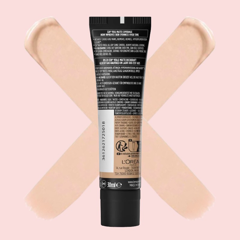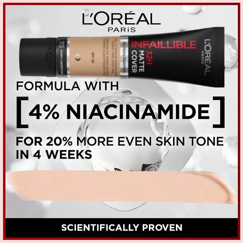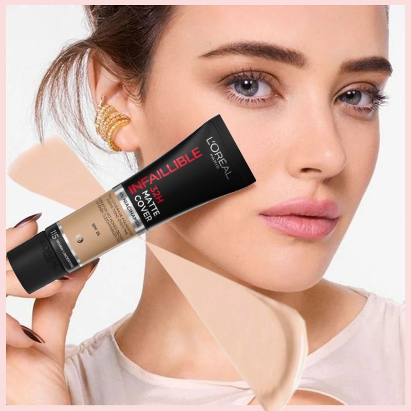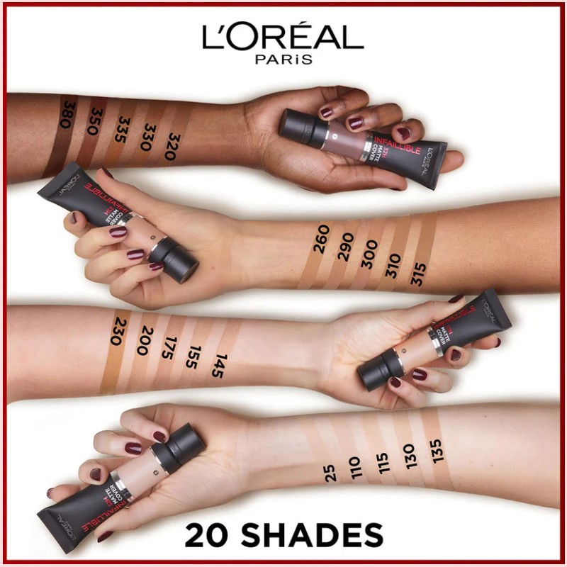 Infallible 32H Matte Cover Foundation by L'Oréal Paris. A full coverage foundation that is long wear but lightweight with a skin-like matte finish, lasting hour after hour. Never cakes, flakes or fades. A long-lasting foundation that provides a skin like finish that feels light on the skin but lasts up to 32 hours. The formula helps to even skin tone. With a high-pigment concentration in a smooth fluid formula, the foundation naturally blends onto your skin for full coverage with a barely-there feel. Shine-proof, transfer-proof and waterproof.